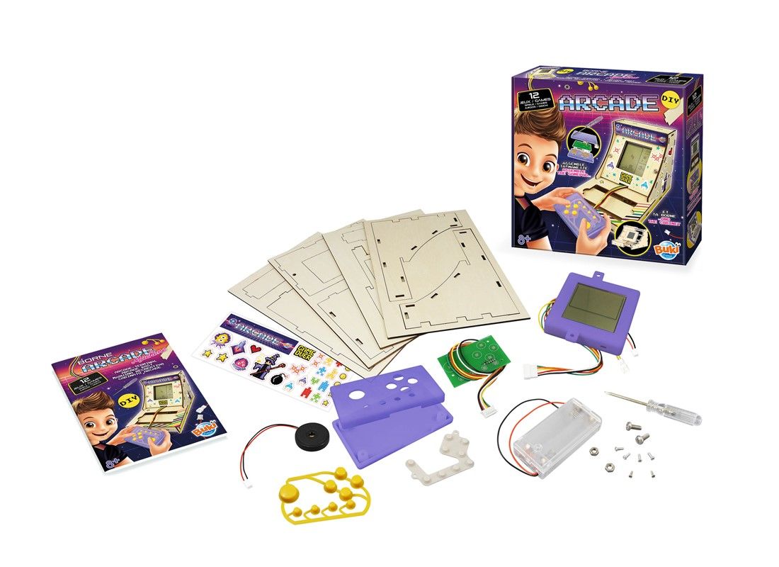 Reconstruisez étape par étape cette fantastique console rétro ! Grâce au tournevis fourni, assemblez facilement la manette et la machine en connectant les différentes pièces, comme l'écran, le haut-parleur et les circuits électriques. Personnalisez votre machine avec les autocollants inclus et profitez de 12 jeux inspirés des classiques d'arcade tels que Tetris, Snake, Space Invaders et bien d'autres. Dimensions de l'emballage : 25 x 7 x 25 cm Fonctionne avec 2 piles LR06-AA (non incluses) Contenu : 4 panneaux en bois, 1 écran, 1 manette, 1 boîtier supérieur, 1 boîtier inférieur, 1 circuit imprimé, des boutons, 1 plot conducteur, 1 haut-parleur, 1 adhésif double face, 1 compartiment à piles, 2 connecteurs blancs, 2 vis longues, 2 écrous, 6 vis, 1 tournevis, 1 planche d'autocollants. Les instructions sont illustrées en couleur pour une compréhension facile. Instructions disponibles en français, anglais, allemand, néerlandais, espagnol et italien. À partir de 8 ans. Ce produit porte le marquage CE conformément à la législation de l'Union européenne.