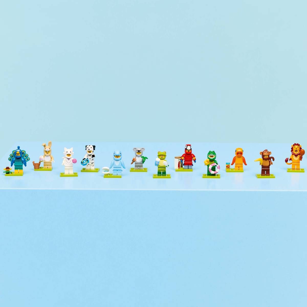 1 des 12 animaux : Dans chaque boîte, les enfants trouveront l'une des 12 minifigurines de cette édition, déguisée en lion, grenouille, crocodile, singe, koala, perroquet, chien, lapin mignon, poisson rouge, chat duveteux, paon ou dauphin.