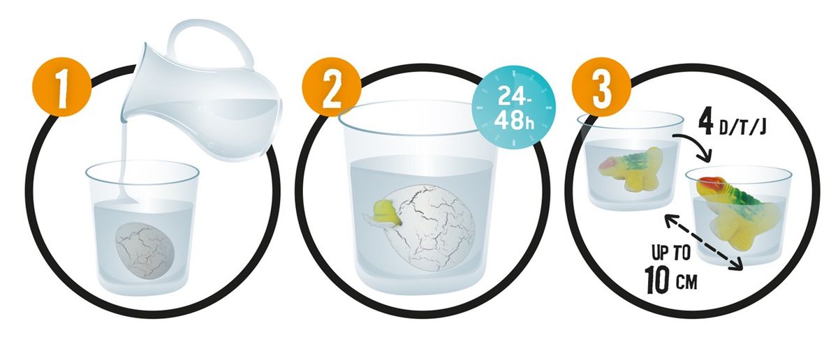 Un œuf à faire éclore pour élever un dinosaure ! Plongez l'œuf dans l'eau froide. Après 24 à 48 heures, la coquille se fissurera et le dinosaure commencera à sortir. Vous pourrez alors retirer la coquille et laisser votre dinosaure dans l'eau pour qu'il continue de grandir. 6 modèles à collectionner : Tricératops, Tyrannosaure, Brachiosaure, Spinosaure, Stégosaure et Ankylosaure. Vendu à l'unité, modèle aléatoire. À partir de 4 ans Attention ! Ce produit ne convient pas aux enfants de moins de 3 ans. Il contient de petites pièces pouvant être avalées. L'ingestion de ces pièces peut provoquer une infection grave et entraîner la mort. Consultez immédiatement un médecin.