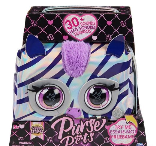 Ce sac à main interactif Purse Pets, à la fois élégant et ludique, est un cadeau idéal pour les enfants et déborde de personnalité. Il réagit au toucher, brille de mille feux et propose plus de 30 sons et réactions amusantes. Purse Pets est un sac à main scintillant en cuir verni argenté à rayures violettes irisées. Il est doté d'une douce crinière, d'yeux inspirés du pop art, d'accessoires en métal et d'une bandoulière argentée ajustable permettant de le porter à l'épaule ou en bandoulière. Lorsque vous le portez, Purse Pets brille de mille feux et émet des sons amusants tout en interagissant avec vous.