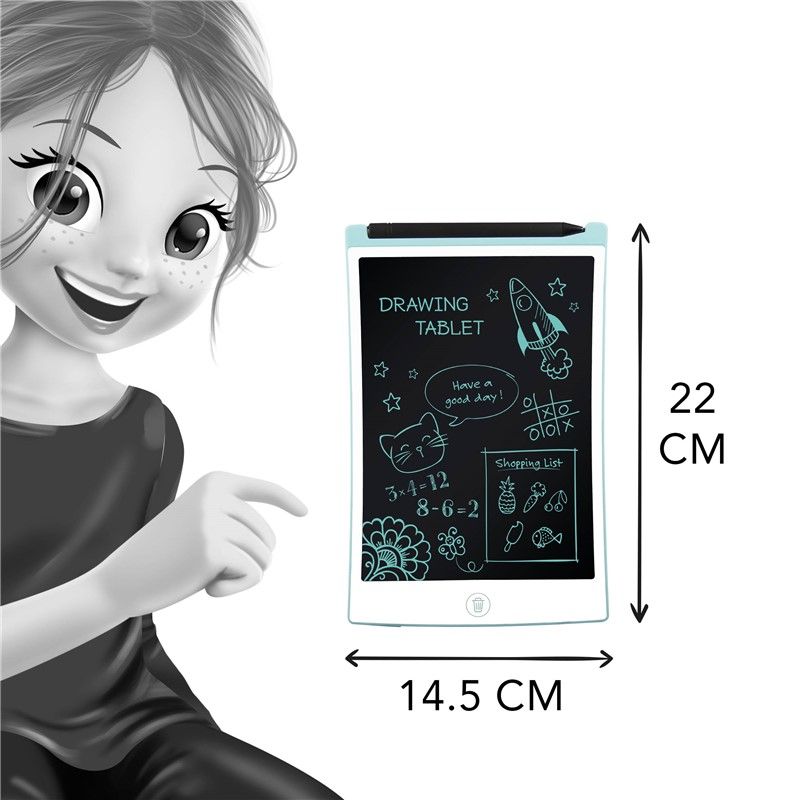 Écrivez, dessinez ou prenez des notes sur la tablette graphique à écran LCD. Pour écrire, utilisez simplement le stylet comme un stylo. Pour effacer, appuyez sur le bouton ! C'est aussi simple que ça ! Tablette graphique BUKI Une tablette et un stylet (la tablette ne pèse que 100 g et mesure 22 x 14,5 cm). Fonctionne avec une pile CR2016 (fournie). Idéale pour s'exprimer, développer sa motricité fine et s'amuser. Facile à transporter. À partir de 4 ans.